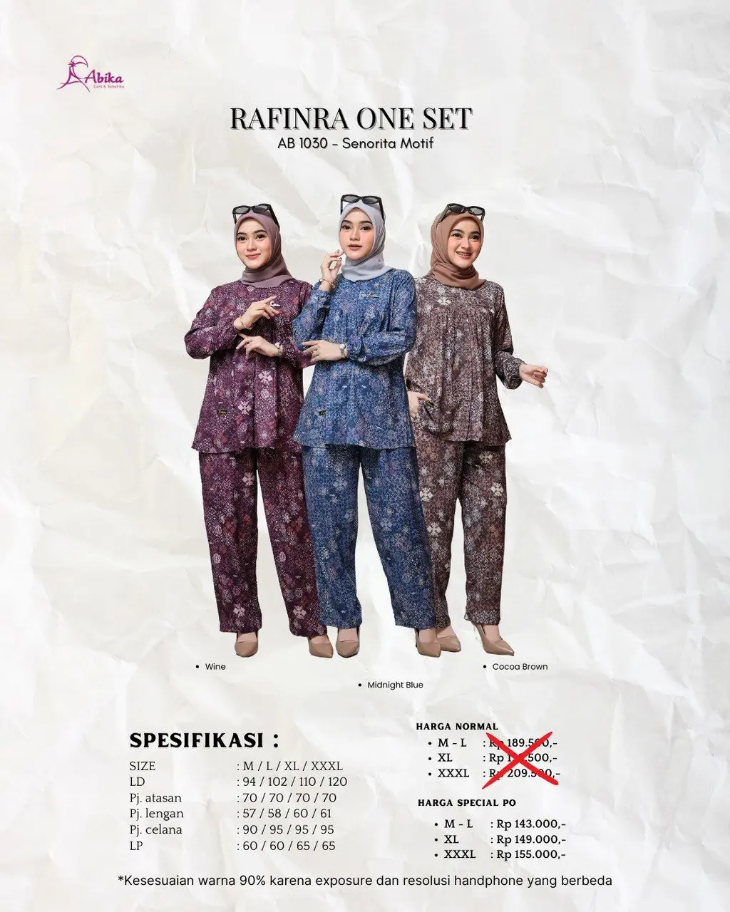 Satu set yang dirancang untuk #AbikaFamily yang ingin tampil effortless, tapi tetap anggun. Terbuat dari bahan Rose Viscose yang ringan, jatuh sempurna, dan adem saat dipakai�Rafinra One Set hadir dengan motif yang menyatu antara atasan dan bawahan, memberi kesan harmonis dan elegan. ??