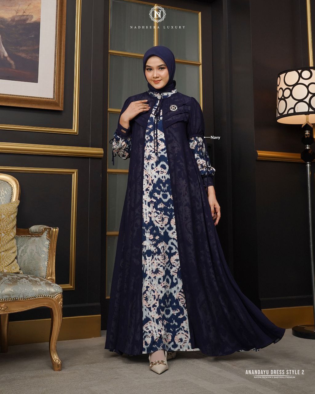 ND-ANANDAYU-DRESS-STYLE-2-NAVY-#S + K-INAYA RUBY SCARF ARMY