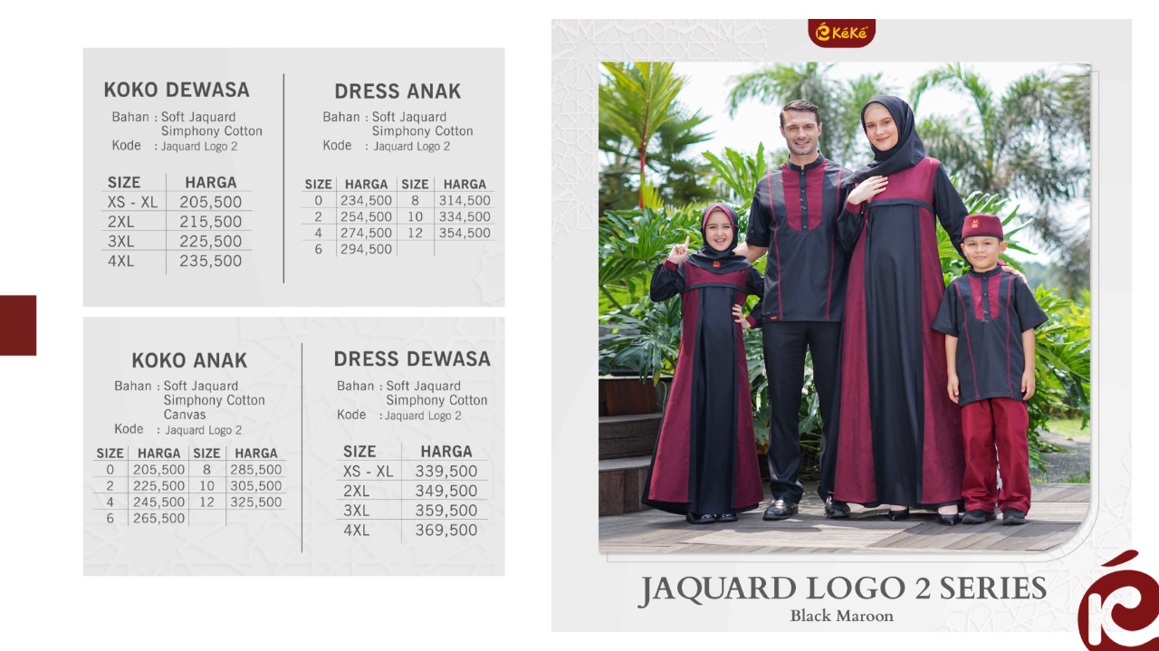 Koleksi sarimbit terbaru dari KeKe Busana yaitu *JACQUARD LOGO 02 SERIES* yang didesain elegant & cantik. Terdiri dari Gamis Ibu dan anak serta Koko Bapak dan anak