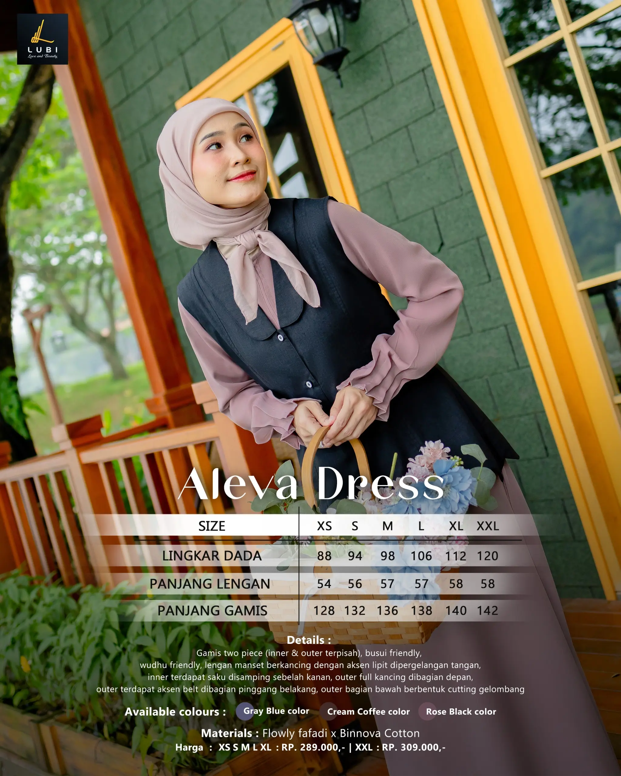 Terbuat dari kain _*Flowly fafadi*_ jenis kain yang memiliki karakteristik tekstur yang halus, flowly, tidak menerawang dan menyerap keringat. Dikombinasikan dengan kain _*Binnova Cotton*_ adalah jenis kain yang memiliki karakteristik tekstur halus, berserat, lembut, memiliki ketebalan yang pas & menyerap keringat sehingga nyaman dikenakan. Sehingga perpaduan keduanya pas, nyaman & look nya cantik dikenakan.