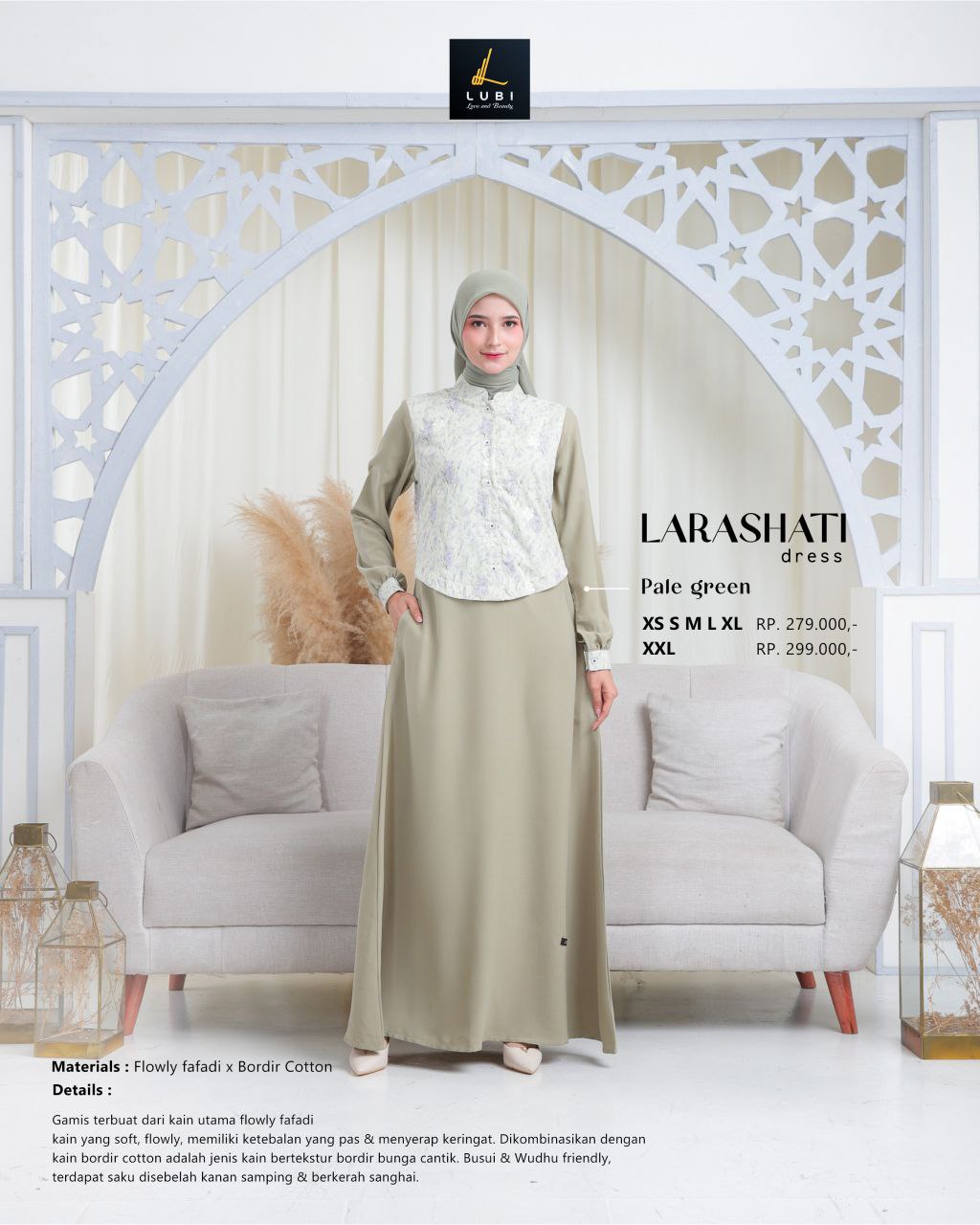 Gamis terbuat dari kain utama _flowly fafadi_ yaitu salah satu jenis kain andalan Lubi yang memiliki karakteristik soft, flowly, memiliki ketebalan yg pas & menyerap keringat. Dikombinasikan dengan kain _bordir cotton_ adalah jenis kain bertekstur bordir bunga cantik yang memiliki ketebalan yang pas, adem & menyerap keringat. Sehingga perpaduan keduanya pas, nyaman saat dikeDetails