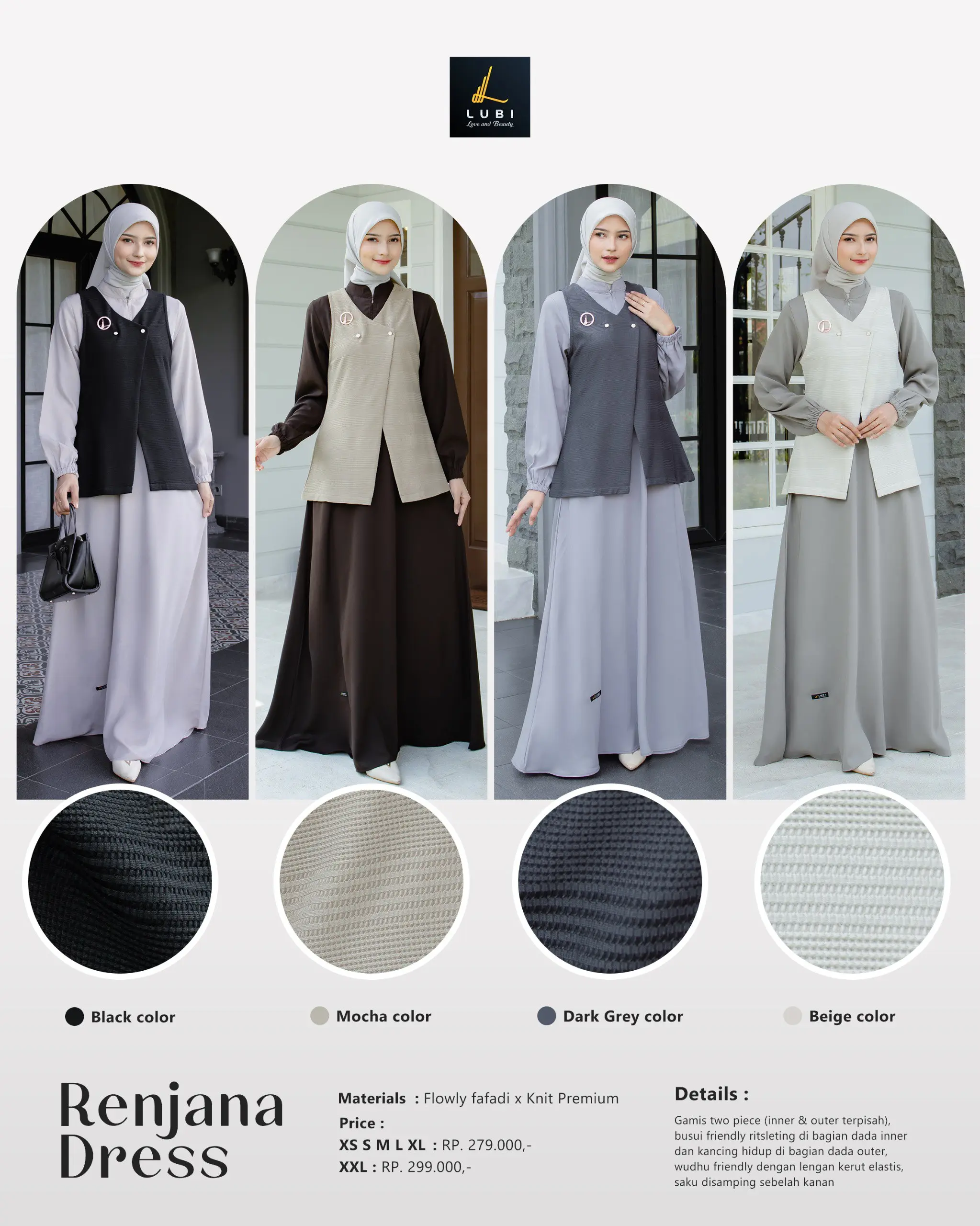 Gamis terbuat dari kain utama _Flowly fafadi_ adalah jenis kain yang memiliki karakteristik tekstur yang halus, flowly, tidak menerawang dan menyerap keringat. Dipadukan dengan kain _Knit premium_ adalah jenis kain bertekstur padat, tebal, flowly & adem. sehingga perpaduan keduanya pas,