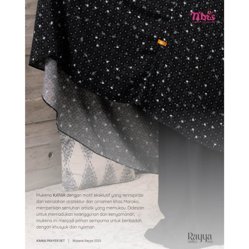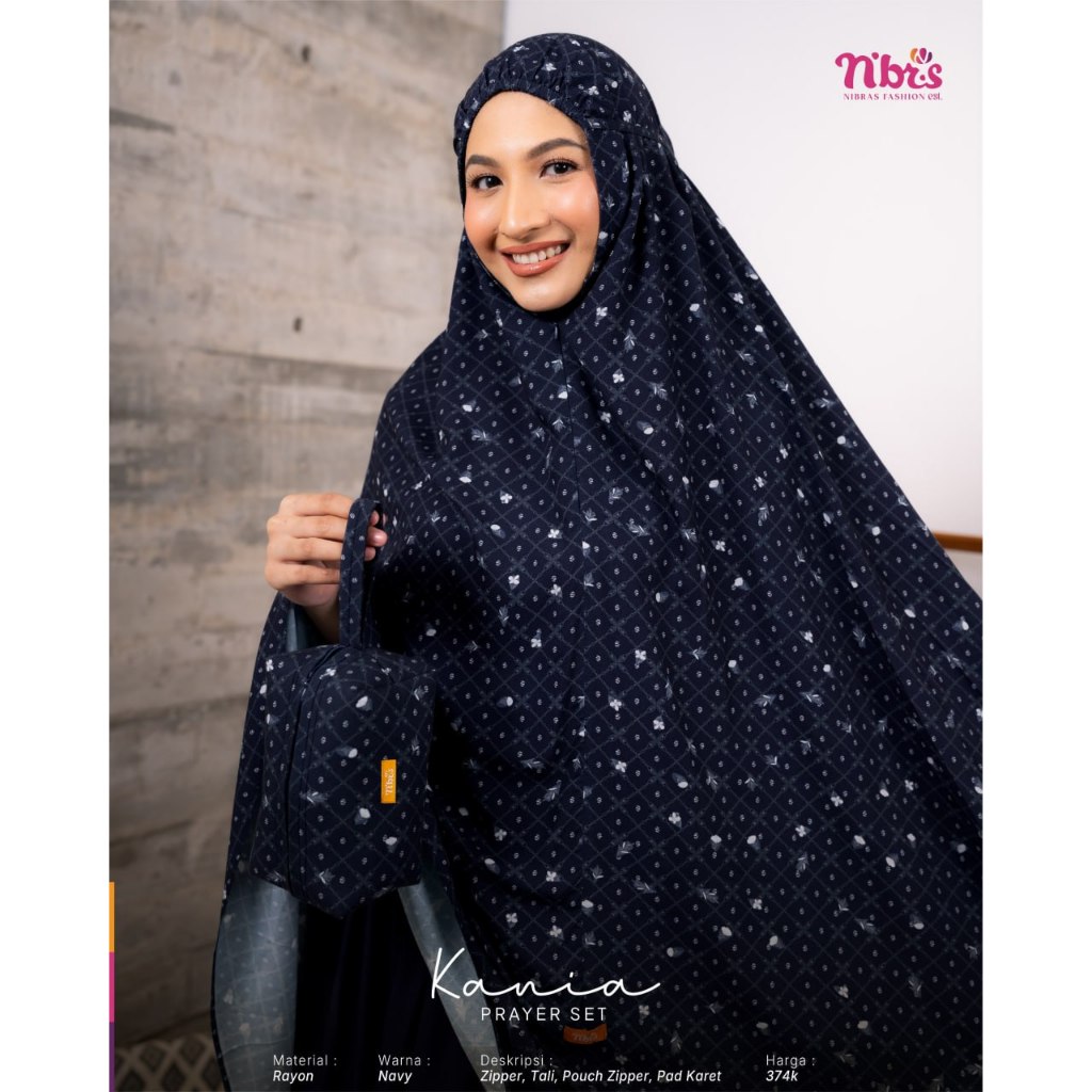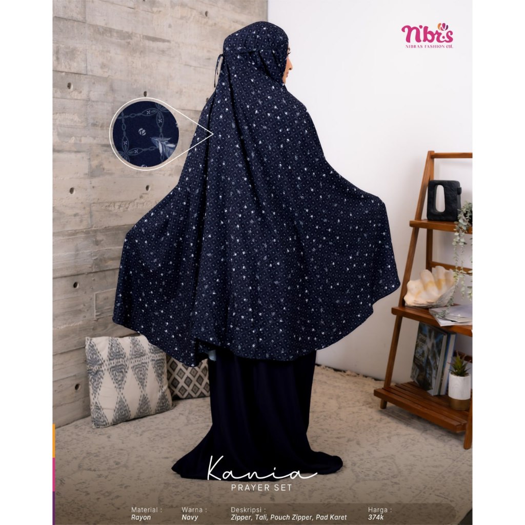 Koleksi mukena terbaru by Nibras Kania Prayer Set Navy yang mengusung inspirasi dari keindahan maroko menciptakan kesan unik dan mewah