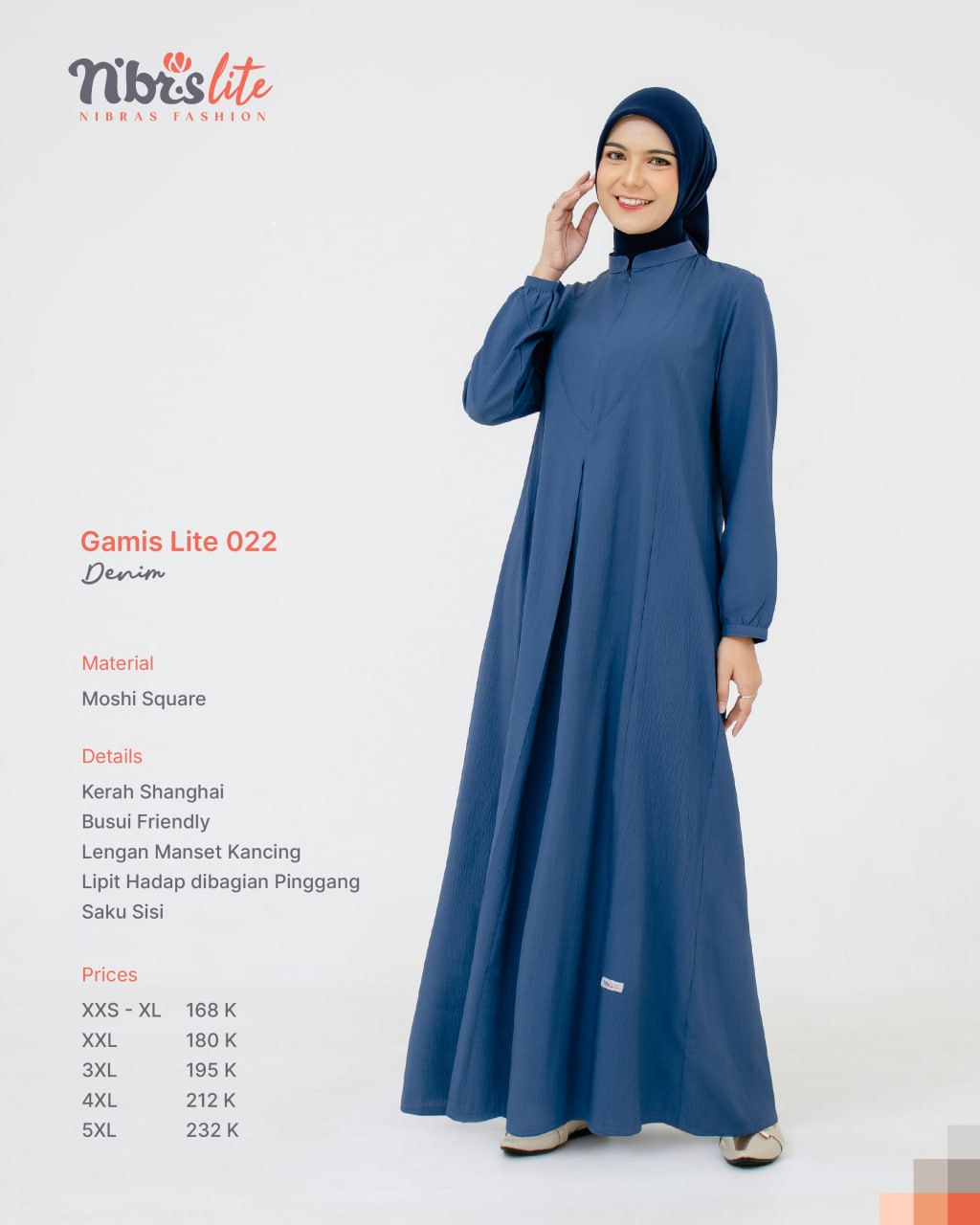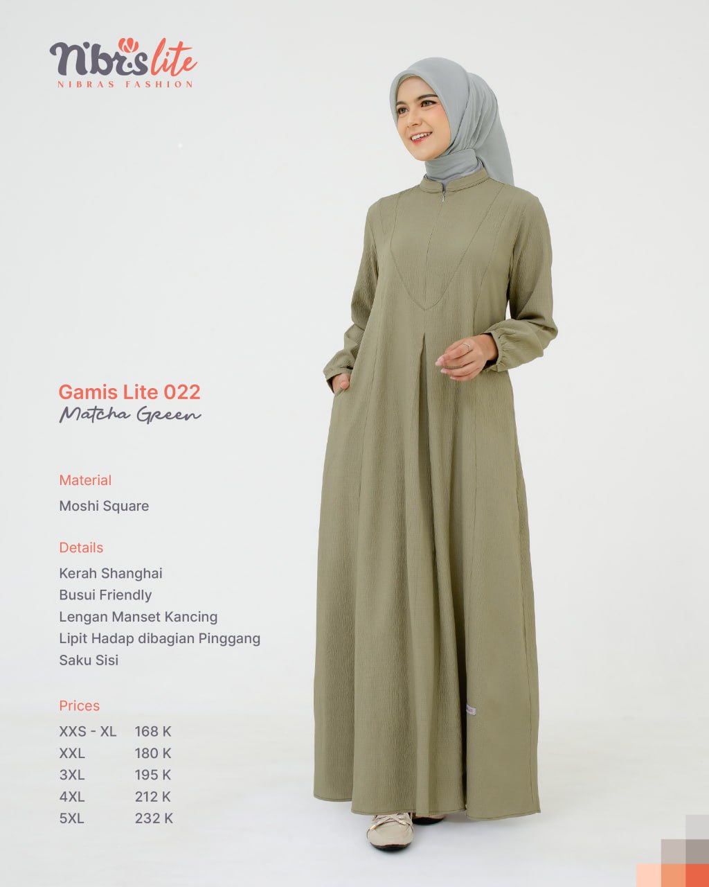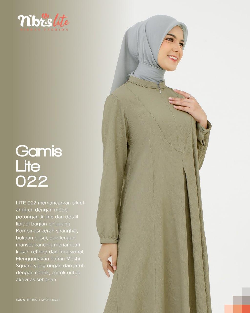 Menggunakan material _Moshi Square_ yang ringan, jatuh dengan cantik, dan tidak mudah kusut, Gamis Lite 022 cocok untuk dikenakan sepanjang hari.?