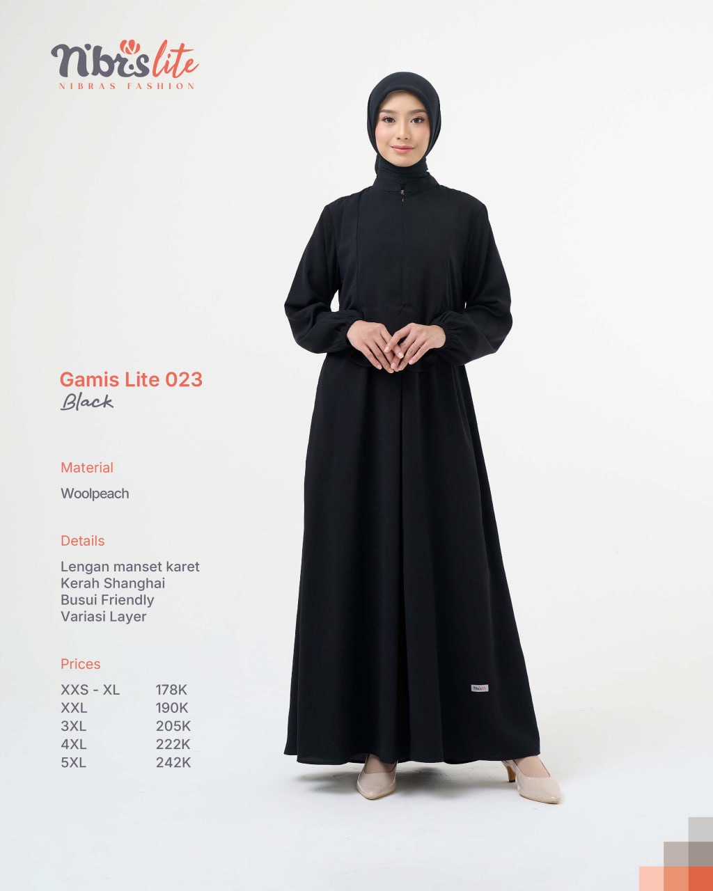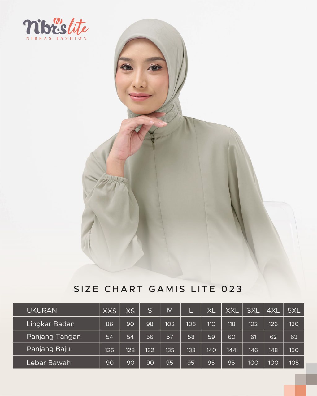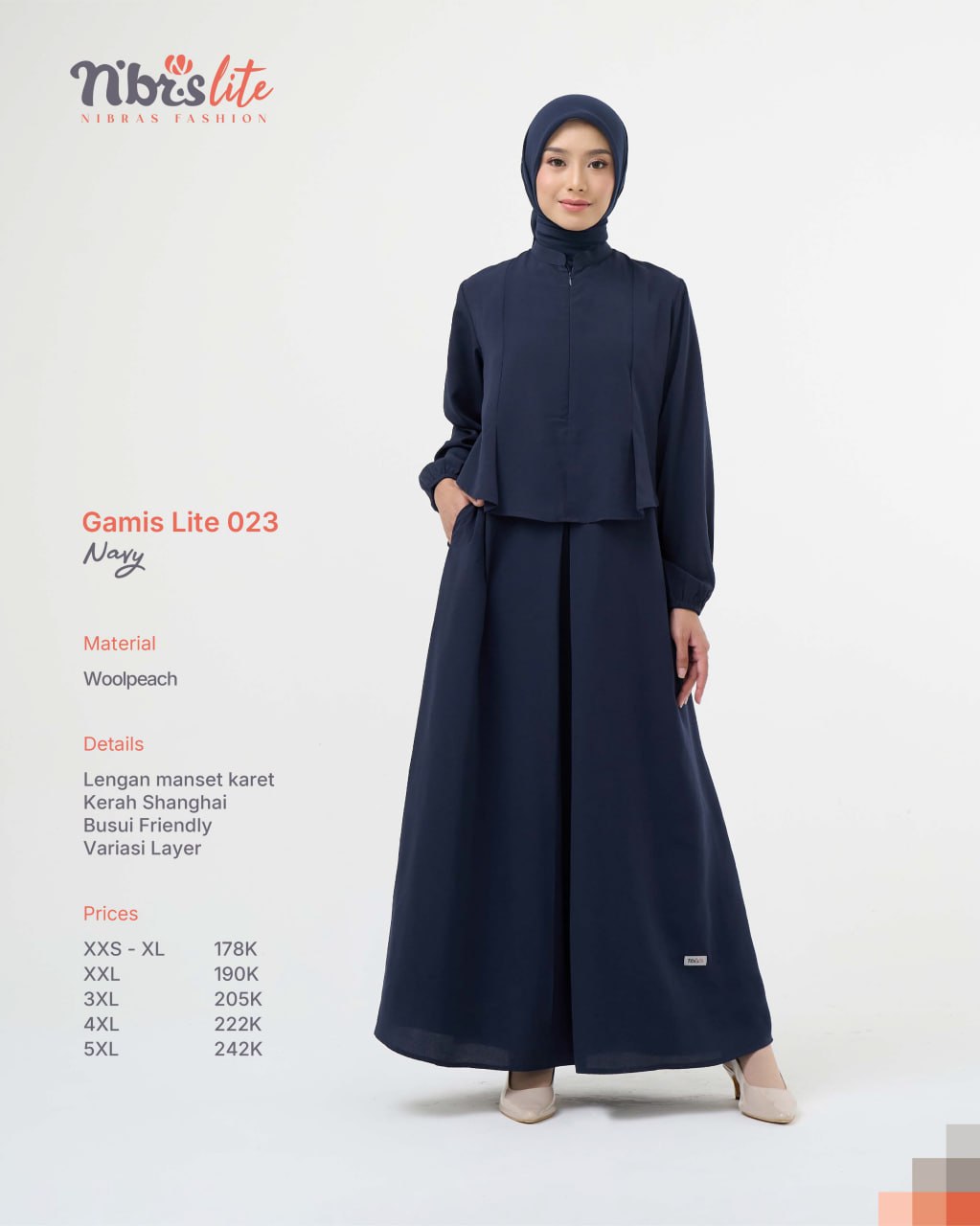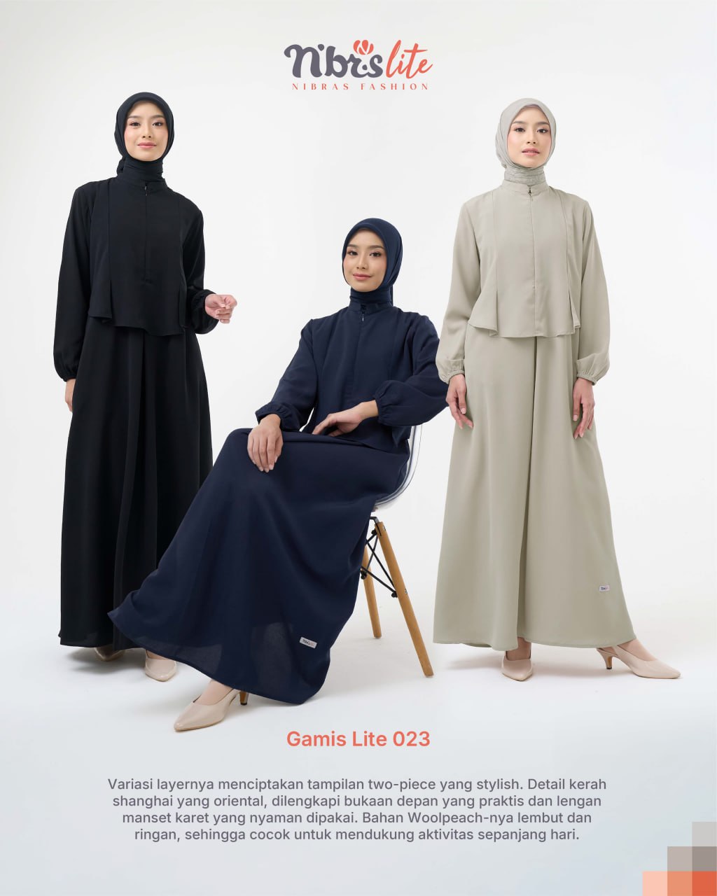 Tampil modis dengan Gamis Lite 023 berlayer yang menciptakan efek two-piece elegan namun tetap praktis.