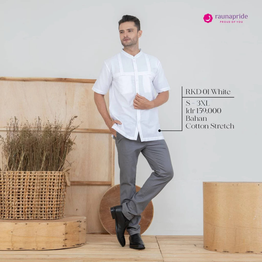 BAJU ATASAN PRIA RAUNA PRIDE RKD 01 WHITE / ATASAN PRIA BAHAN COTTON STRETCH WARNA PUTIH LENGAN PENDEK / PROMO BIG SALE AKHIR TAHUN DISC 40% / TOKO GROSIR BAJU BRANDED RAHNEM RAUNA